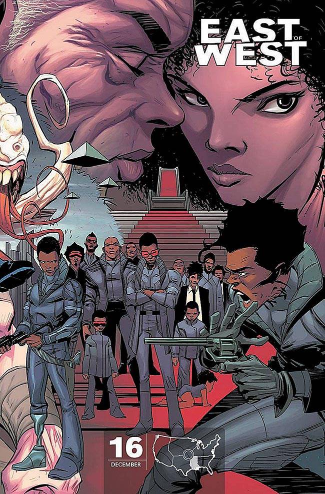 Capas das revistas que publicaram East of West (2013) no Brasil na ordem das edições originais
