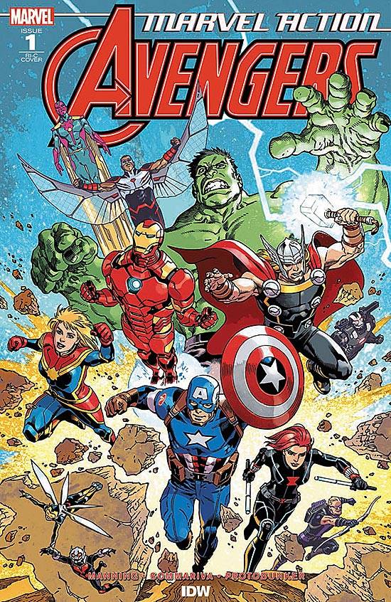 Capas das revistas que publicaram Marvel Action: Avengers (2018) no Brasil na ordem das edições originais