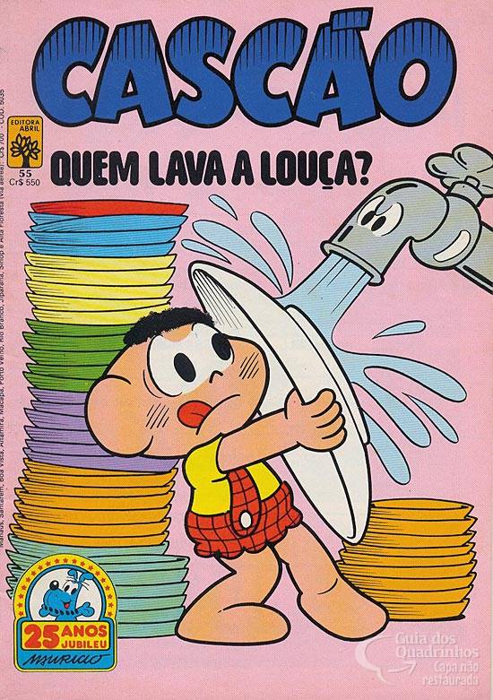 Cascão foi obrigado pela mãe de lavar o prato depois de comer, deixando Cebolinha bem animado de ver o amigo lavando as mãos pela primeira vez.