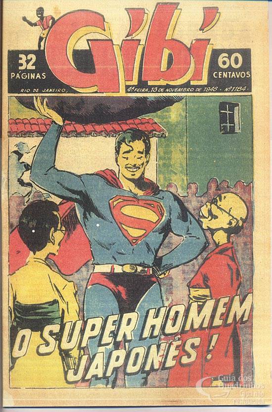 HQ colorida das páginas centrais. Apesar do título em português (“The war medals”, no original), este capítulo faz parte da história “The japanese Superman”. Naquela época, o herói tinha um poder curioso: para se passar por outro homem, bastava enrijecer os músculos faciais. Mas em outra HQ, ele recorria à maquiagem para se disfarçar. Ou, para virar Clark Kent, bastava um simples óculos. Na verdade, Siegel ainda não tinha definido suas habilidades metamórficas, fazendo experiências aqui e ali.