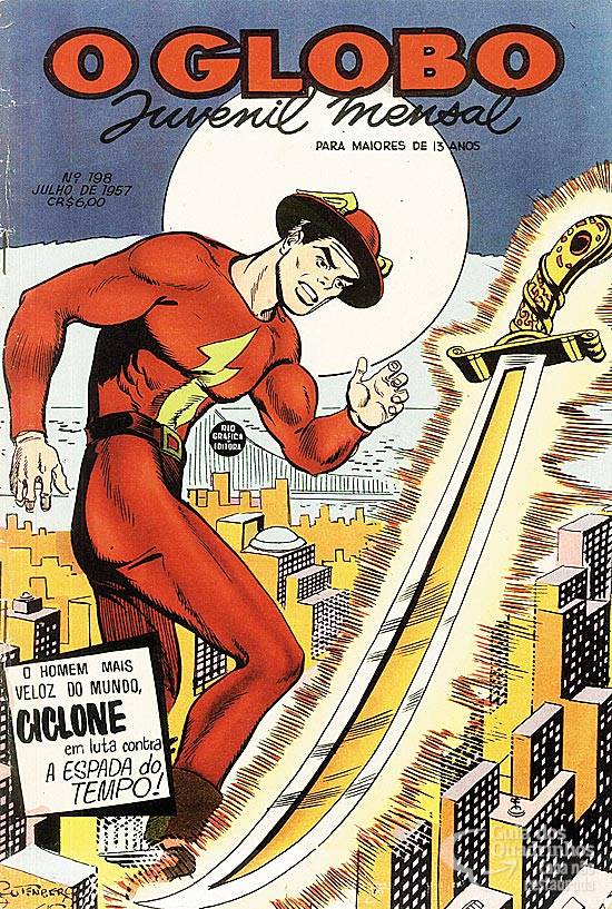 A mitologia nos conta que, certa vez, Dâmocles foi obrigado a sentar-se sob uma espada, que pendia suspensa por um simples fio de cabelo! Desde então, a expressão ESPADA DE DÂMOCLES tem significado medo do desconhecido... O pânico que ataca quando se espera que algo vá acontecer e não se sabe quando! Somente Ciclone, o homem mais veloz do mundo, poderia salvar a cidade de Keystone de sorte idêntica, quando desfiou um estranho malfeitor que usava como arma.