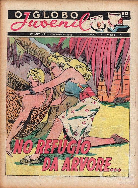 Tradicional prancha colorida da última capa. Capítulo 147 de uma aventura sem título de Brick Bradford: desta vez, nosso herói se encontra no refúgio da árvore.
