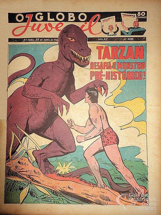 Capítulo 67 (correspondente à prancha 746), “Ataque”: o Homem-Macaco enfrenta o dinossauro da selva dos pigmeus. Publicado originalmente em 24 de junho de 1945.