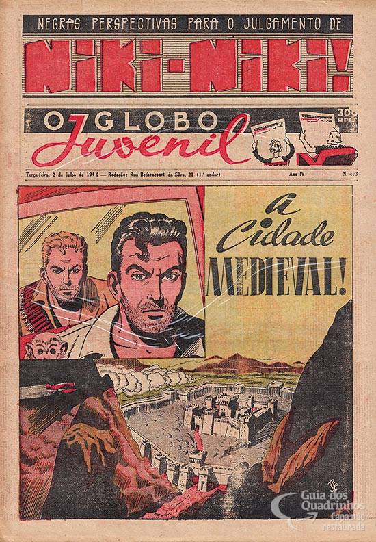 Tira colorida da página central. Publicada originalmente em 14 de abril de 1940.