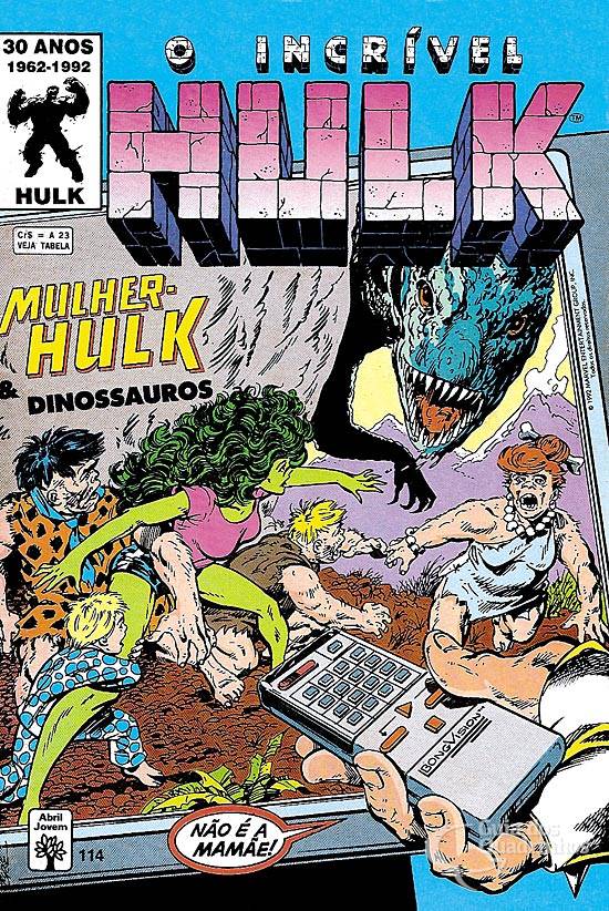 Notas: Byrne homenageia aqui várias atrações da TV: Os Flintstones, Super Mouse, Os Jetsons, RoboCope Os Três Patetas. O checklist que a Mulher-Hulk atravessa quando "rasga" a página foi uma paródia concebida pelo editor da revista na época, Mario Luiz C. Barroso.