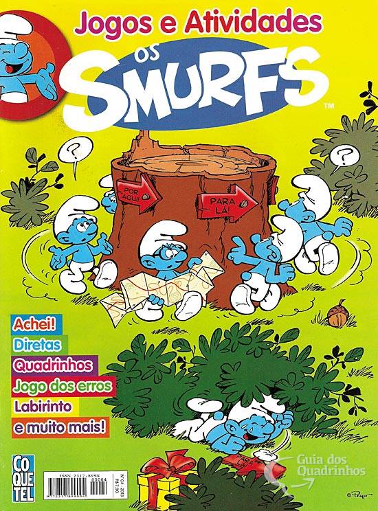 Diversas gags em um quadrinho, de jogos de passatempo, com diversos smurfs (diversas páginas).