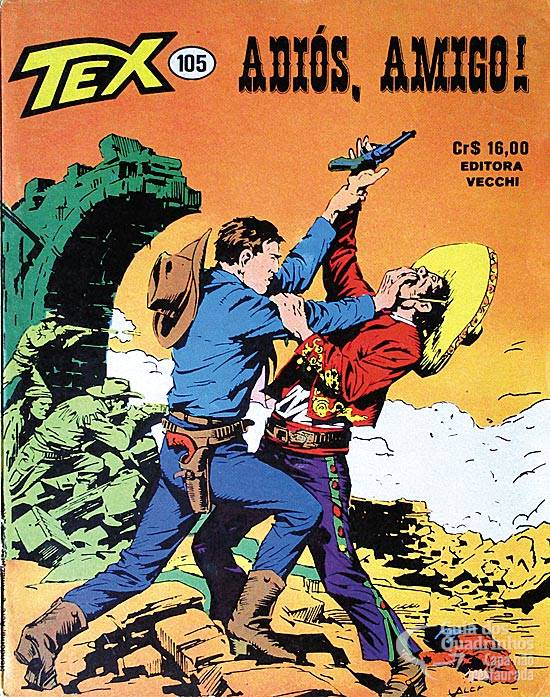 Título original italiano: “Adiós, amigo!”. Continuação do n° anterior. Tex, Carson, Kit e Tigre, mais os amigos Pat e Montales, estão entrincherados na isolada fazenda deste último, no México. A situação vai ficando cada vez mais dramática, pois são atacados por uma inacreditável força conjunta de bandidos e soldados mexicanos. A única saída para nossos heróis é a descoberta de um túnel secreto nos subterrâneos da propriedade...