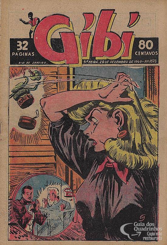 Prancha colorida das páginas centrais. Capítulo 20 de um policial sem título em português de “Steve Roper” (“Léo Carter”, na versão do “Gibi”). Publicado originalmente em 11 de abril de 1948.