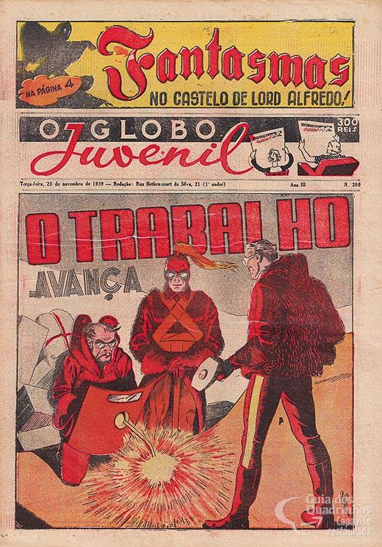 HQ publicada na página central colorida, como “top” de “Flash Gordon”. Capítulo 21 de uma aventura sem título em português de Jim das Selvas. Publicado originalmente em 10 de setembro de 1939.