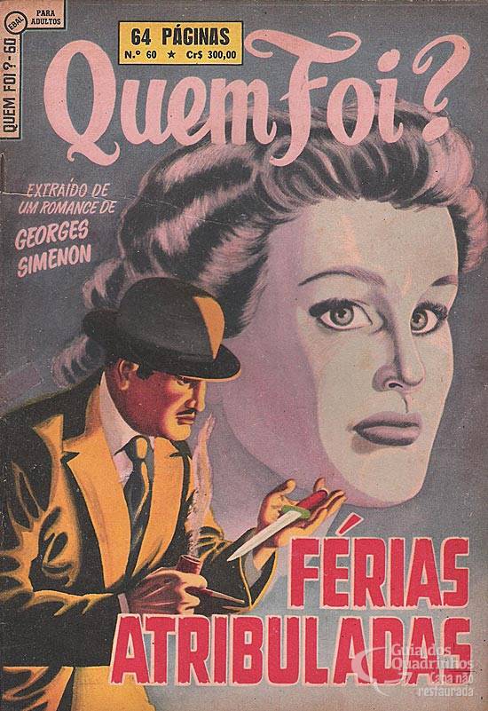 Quadrinização do romance de Simenon, “Les vacances de Maigret” (“As férias de Maigret”), de 1947, desenhada PROVAVELMENTE por Aylton Thomaz (no primeiro quadrinho aparece uma assinatura que parece ser “Aylton”). O inspetor Maigret, embora de férias em Olonne, com a sua argúcia de brilhante detetive tenta elucidar mais um escabroso caso de três assassinatos...