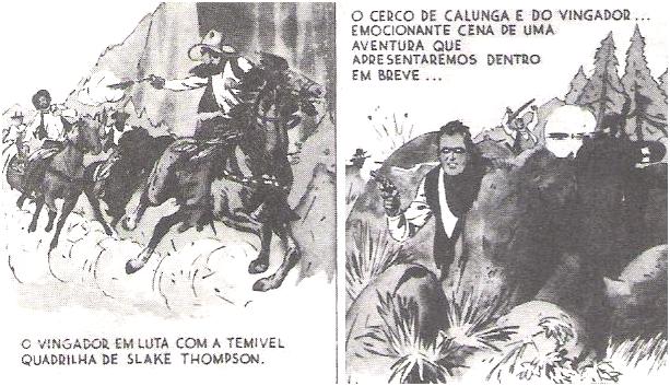 O Vingador surgiu pela primeira vez em fevereiro de 1943, transmitido diariamente (menos aos domingos), das 17:45 as 18:00. Mas acabou desaparecendo no pós-Guerra. Nos anos 60, no entanto, a editora Outubro lançou um novo Vingador, ainda um cowboy mascarado, mas desta vez todo vestido de negro e cuja identidade secreta era a do pacato Nelson Coston, um vaqueiro de Dodge City. Por esconder sua valentia, o pobre Coston era desprezado pela bela Sally, filha do dono do jornal local. Quando surgiam problemas, o calmo cowboy se transformava no Vingador, montado em seu fiel cavalo, Raio Branco.